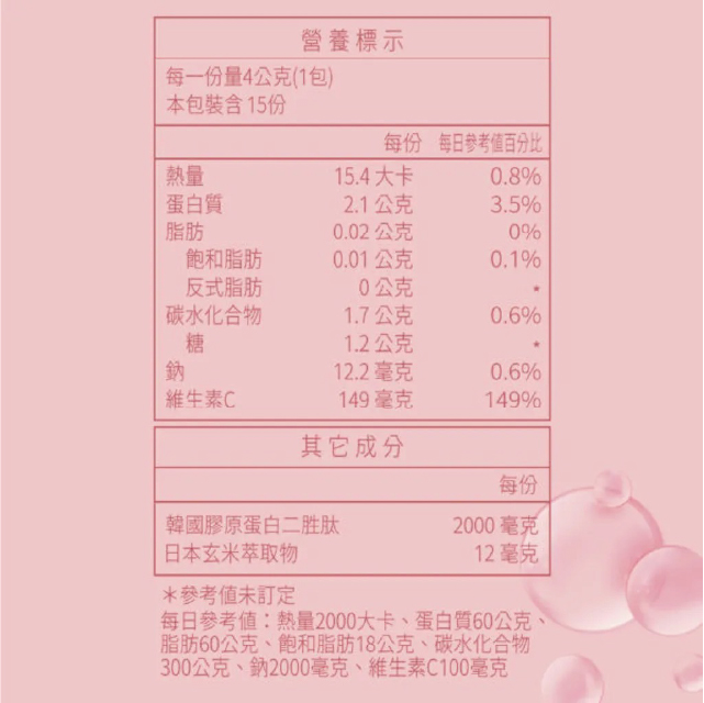 二胜肽膠原蛋白粉、D-山梨醇、菊苣纖維、檸檬粉(檸檬原汁、麥芽糖漿(玉米澱粉、水))、複方維生素C(抗壞血酸、柑橘萃取物、米糠粉)、玄米萃取物(含10%神經醯胺(賽洛美)、玉米糊精)、山竹果抽出物(含桑橙素糖苷、糊精)、發酵乳酸桿菌(麥芽糊精、Lactobacillus fermentum)