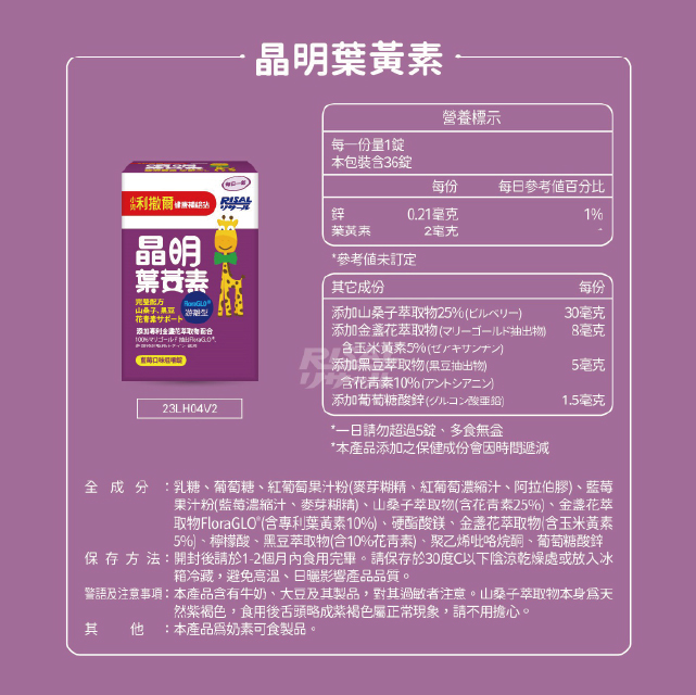 乳糖、葡萄糖、紅葡萄果汁粉(麥芽糊精、紅葡萄濃縮汁、阿拉伯膠)、藍莓果汁粉(藍莓濃縮汁、麥芽糊精)、山桑子萃取物(含花青素25%)、金盞花萃取物FloraGLO®(含專利葉黃素10%)、硬脂酸鎂、金盞花萃取物(含玉米黃素5%)、檸檬酸、黑豆萃取物(含10%花青素)、聚乙烯吡咯烷銅、葡萄糖酸鋅