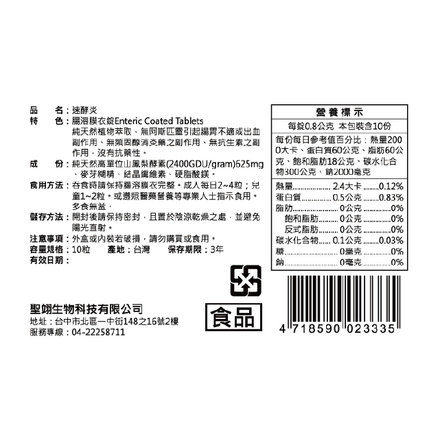 純天然高單位山鳳梨酵素 (2400 GDU/gram) 625 mg、麥芽糊精、結晶纖維素、硬脂酸鎂