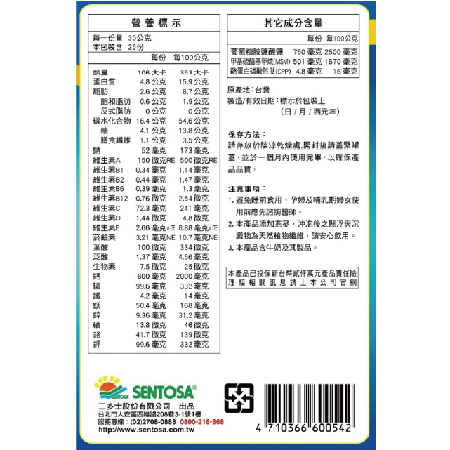燕麥粉、脫脂奶粉、芥花油粉(葡萄糖漿、芥花油、乾酪素鈉、脂肪酸甘油脂)、麥芽糊精、碳酸鈣、大豆蛋白、葡萄糖胺鹽酸鹽(玉米發酵)、麥芽糊精、甲基硫醯基甲烷(MSM)、香料、綜合礦物質(磷酸三鈣、氧化鎂、焦磷酸鐵、氧化鋅、硫酸錳、二氧化矽、硫酸銅、三氯化鉻、硒酸鈉、碘化鉀)、果糖、關華豆膠、綜合維生素(維生素C、維生素E、菸鹼醯胺、維生素A、本多酸鈣、維生素D₃、維生素B₆、維生素B₁、維生素B₂、葉酸、生物素、維生素B₁₂)、葡萄糖酸鋅、酪蛋白磷酸胜肽(CPP)、蔗糖素(甜味劑)