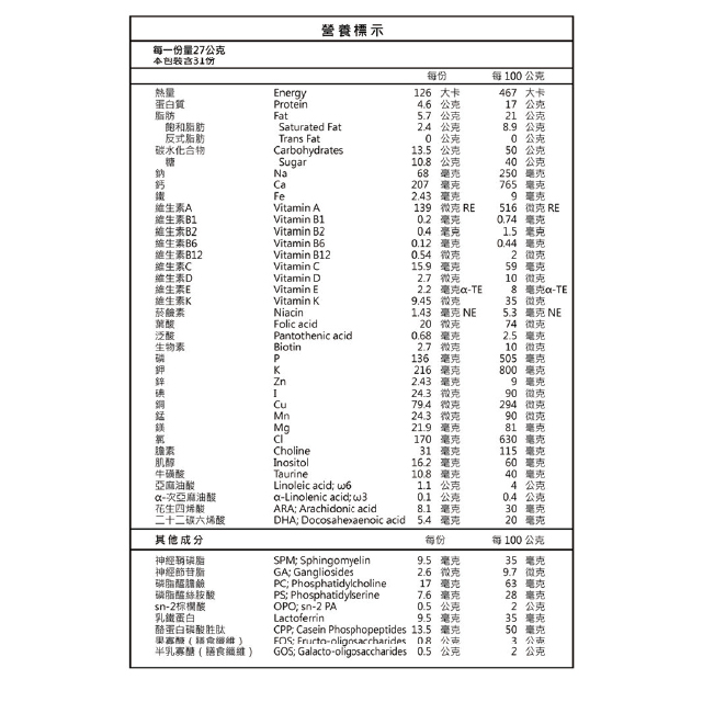 脫脂奶、乳糖、麥芽糊精、大豆油、椰子油、果糖、高2位-棕櫚酸植物油(含OPO)、半乳寡醣、果寡醣、乳清蛋白、高油酸葵花籽油、磷酸鈣、大豆卵磷脂、酪蛋白磷酸肽肽、氯化鉀、重酒石酸膽鹼、氯化鈉、焦磷酸鐵、維生素C、檸檬酸鈣、高山被孢黴發酵產物(含ARA)、檸檬酸鈉、氧化鎂、DHA藻油、乳鐵蛋白、牛磺酸、肌醇、氫氧化鉀、硫酸鋅、混合濃縮生育醇(抗氧化劑)、維生素E、菸鹼醯胺、碘化鉀、L-抗壞血酸棕櫚酸酯(抗氧化劑)、硫酸銅、維生素B2、本多酸鈣、維生素B1、維生素A粉末、維生素B6、硫酸錳、β-胡蘿蔔素、葉酸、維生素K1、維生素D3、維生素B12