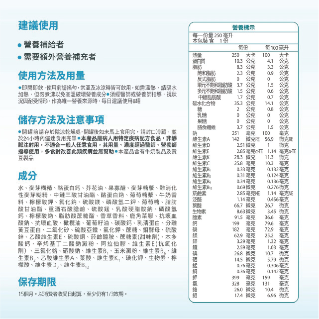 ※ 本產品屬病人用特定疾病配方食品,非靜脈注射用,不適合一般人任意食用,其用量、濃度經過醫師、營養師指導使用,多食對改善此類疾病並無幫助