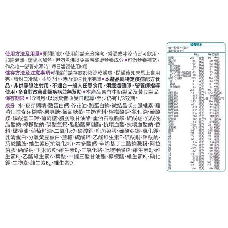 ※ 本產品屬特定疾病配方食品,非供靜脈注射用,不適合一般人作正常食用,需經過醫師、營養師指導使用,多食對改善此類疾病並無幫助