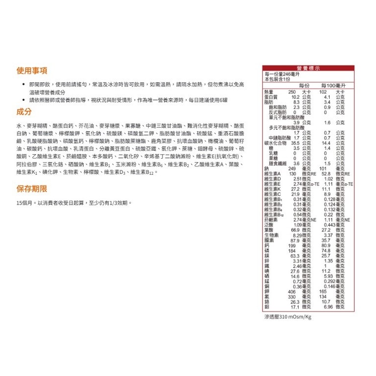 ※ 即開即飲,使用前請充分搖勻,常溫或冰涼時皆可飲用,如需溫熱,請隔水加熱,但勿煮沸以免高溫破壞營養成分