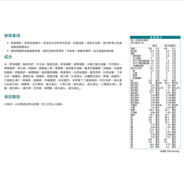 ※ 即開即飲,使用前請充分搖勻,常溫或冰涼時皆可飲用,如需溫熱,請隔水加熱,但勿煮沸以免高溫破壞營養成分